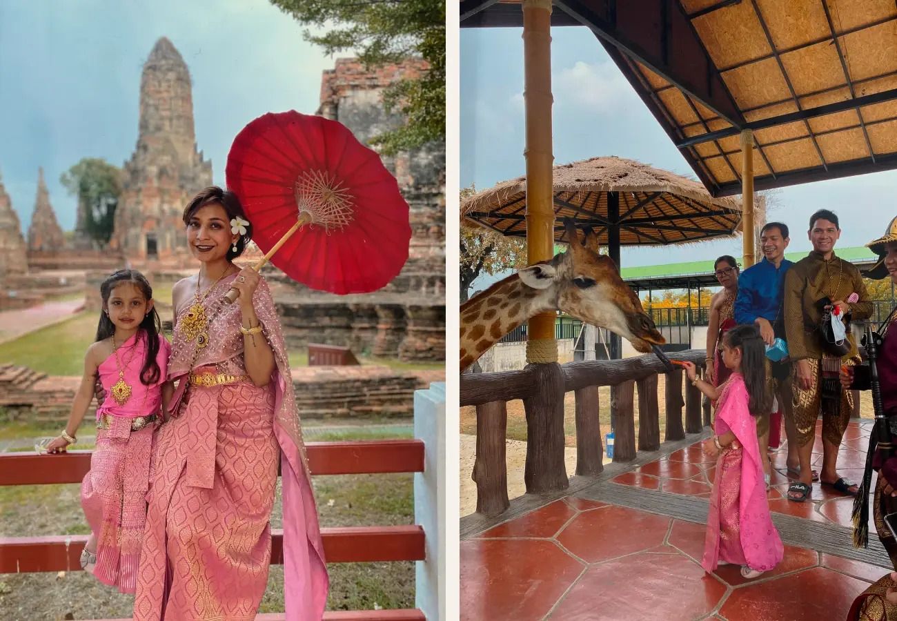 Ayutthaya is one of those destinations that feels familiar but still interesting every time you go. We visited with Ploy’s family and started the morning by trying on traditional Thai outfits near the historical park. Moana loved her outfit, it adds a fun twist to the day and makes the walk through the temples feel even more memorable, like you’re part of history.