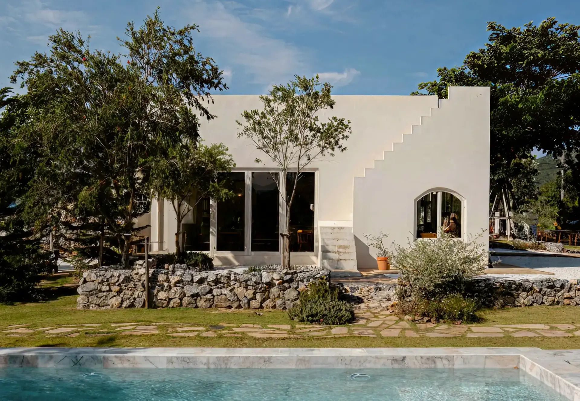 A cozy, minimalist stay surrounded by forest. Think of a vintage white house in Greece or Italy, tucked into a tropical hillside. There’s a white marble pool glistening in the sun, and two little ducks paddling in the garden pond. For kids, there’s a fun little bike circuit right on the property, perfect for showing off their BMX skills.