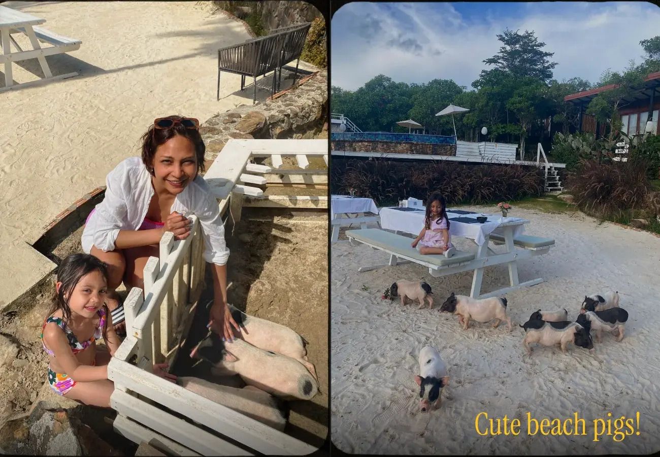 We checked into To the Sea Resort, a relaxed beachfront stay overlooking some of the clearest, warm tropical water we’ve seen in Thailand. Within minutes, Moana had found the tiny pigs wandering around the sand and decided they were her new best friends.